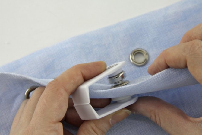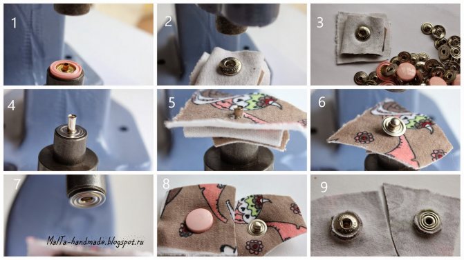 Перед установкой застежек сначала делают специальные отверстия на ткани. Надо постараться, чтобы диаметры дырки в материале и ножки кнопки совпадали или же, отверстие было немного меньше. Детали закрепляются специальным инструментом, который можно купить отдельно или в наборе с застежками. Оборудование комплектуется особым прессом-матрицей и специальными насадками – пуансонами (разных диаметров). В домашних условиях умельцы при установке кнопок пользуются обычными молотком, крестовой отверткой или дюбелем, деревянным бруском, плоскогубцами, спицей.