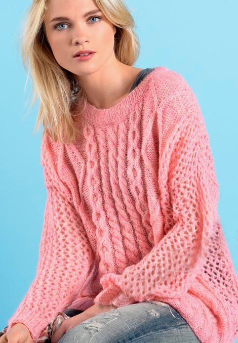 Оформление ажуром подойдет для женских свитеров, а также для всех видов детских моделей. Для того, чтобы узор получился эффектным, следует подбирать натуральную пряжу невысокой плотности.