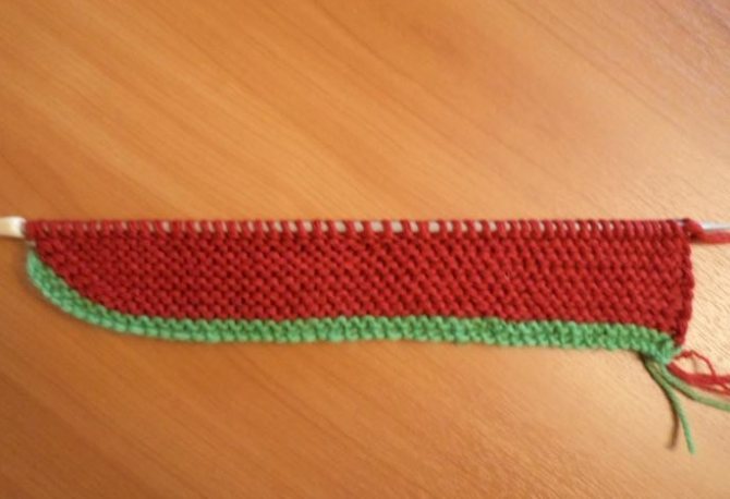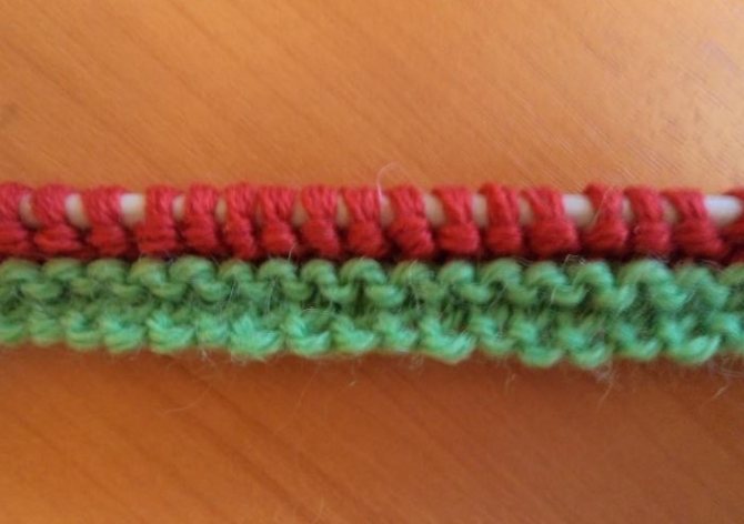 Набираем пятьдесят петель. Далее берем нить зеленого (можно другого, эта нить -вспомогательная) цвета и вяжем два ряда. Красной нитью вяжем следующие два ряда.