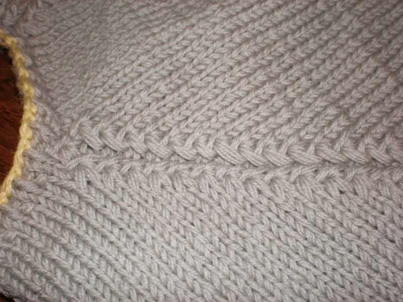 Первый ряд является замыкающим, в том случае, если вяжется свитер или полувер, а при вязании пальто, кофты или кардигана вязание оставляют в первозданном виде. Со следующего ряда вывязывают росток – это связано с разницей кроя между деталями переда и спинки. Высоту переда наращивают поворотными рядами в области спинки, с частичным провязыванием рукавов – таким образом, поднимается высота спинки в области шеи.