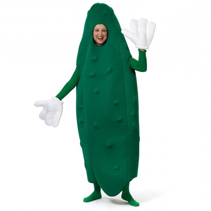 К примеру, костюм огурца. Для него подойдут флисовые свитера или же ткань от старого зеленого пальто. Чтобы придать костюму соответствующий вид, нужно сделать заготовку из зеленой плотной ткани в форме огурца. Чтобы она держала форму, ткань надо продублировать тонким поролоном. Кстати говоря, им лучше всего формировать костюмы овощей. Ширина заготовки должна соответствовать объемам ребенка. Для ног прорезаются дырки таким образом, чтобы малыш мог ходить. Вверху можно сделать прорези для рук и лица или же зафиксировать костюм на плечах. В таком случае костюм будет органично смотреться со шляпкой в виде носика огурчика или с зелеными закрученными усиками и листочком.