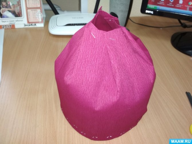 Картофель сделала немного по другому. Вырезала из коричневой гофрированной бумаги квадрат, накрыла сверху каркас шапочки таким образом, чтобы сверху оставалась бумага, и закрепила с четырех сторон. Затем собрала оставшуюся бумагу равномерно по кругу. Сверху в нескольких местах изнутри скрепила степлером, чтобы получили «глазки».