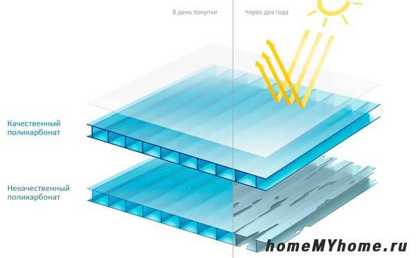За счет того, что поликарбонат – гибкий материал, раскроить и закрепить его несложно. Однако при покупке стоит обращать внимание на его качество, чтобы в дальнейшем он легко переносил любые температурные давления и не портился под воздействием солнечных лучей и влаги.