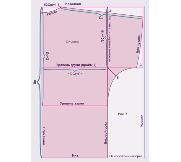 - Провести биссектрису из угла проймы на 5-7 сантиметров и плавно вывести низ рукавов и боковой шов;