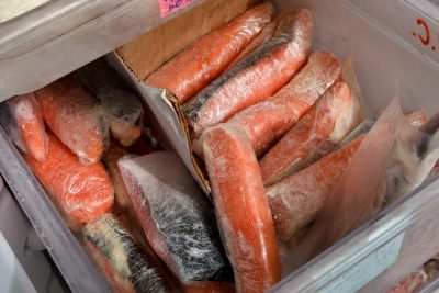 В условиях сильной заморозки хорошо хранится красная рыба (соленая форель, семга и др.)