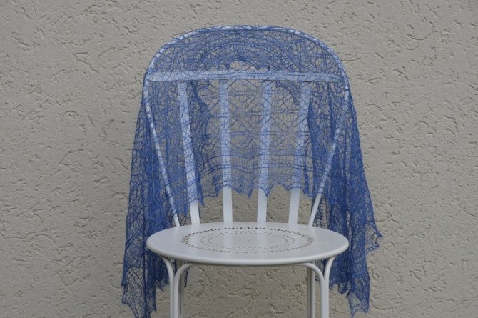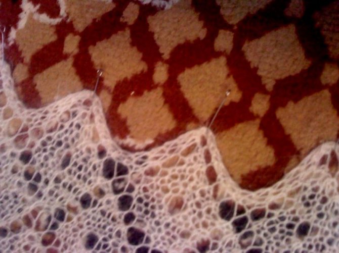 - После стирки хорошенько растягиваем полотно косынки на горизонтальной ровной поверхности, закрепив булавками через каждый 5-7 см, так изделие будет долго держать форму. Если не растянуть ажурный платок сразу перед первой ноской, можно распрощаться с красивым и ровным узором, — не стоит откладывать эту процедуру.
