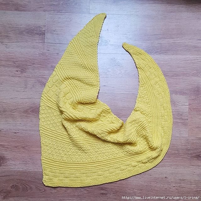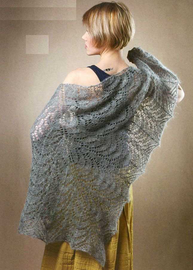 Самый простой способ вязания этого вида платка — платочная вязка (во всех рядах все петли вяжутся лицевыми). В этом случае платок получается очень пластичный, особенно если будет связан из пряжи-цепочки. Носить его можно широкой частью вперед, заведя концы за шею. Ширина ровной части в этом случае должна быть примерно равна ¼ части обхвата вашей груди. Разнообразить данную модель можно, вывязывая в центральной части различные узоры — ажуры, теневые или рельефные узоры. В этом случае платок будет иметь лицо и изнанку.
