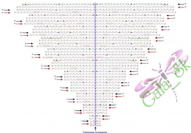 27 р.: КП, НК, 5 ЛП, 2 вместе ЛП, НК, 11 ЛП, НК, 2 вместе скрещенная, 5 ЛП, НК, КР