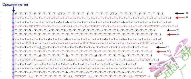 По приложенной ниже схеме, будет проще сориентироваться в вязании. Правда она нарисована от руки, но понять вполне можно.