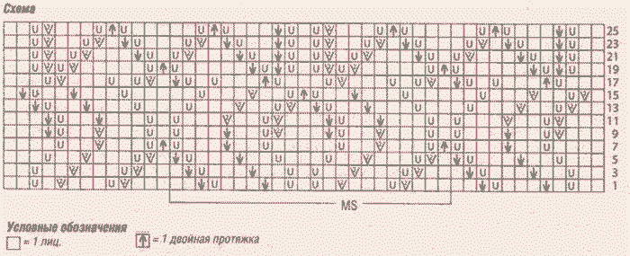 25 р.: КП, НК, 5 ЛП, 2 вместе ЛП, НК, 9 ЛП, НК, 2 вместе скрещенная, 5 ЛП, НК, КР