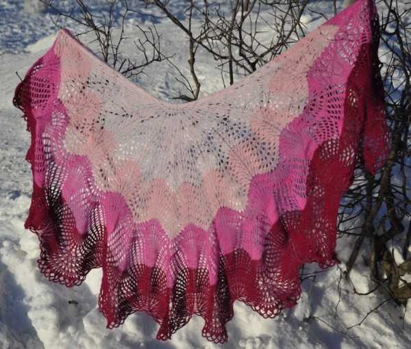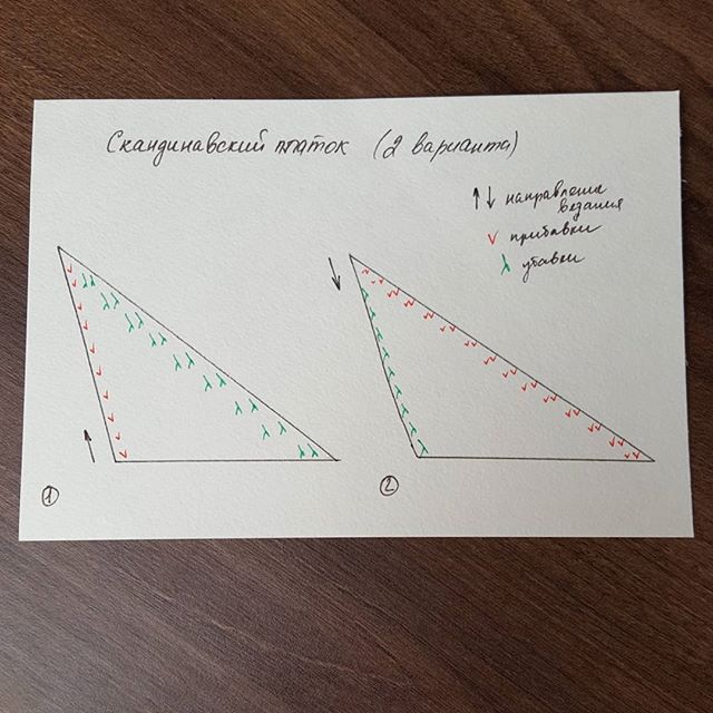 Возможны два варианта вязания — от широкой стороны к углу и от угла к широкой стороне. В обоих случаях форма платка получается одинаковой.