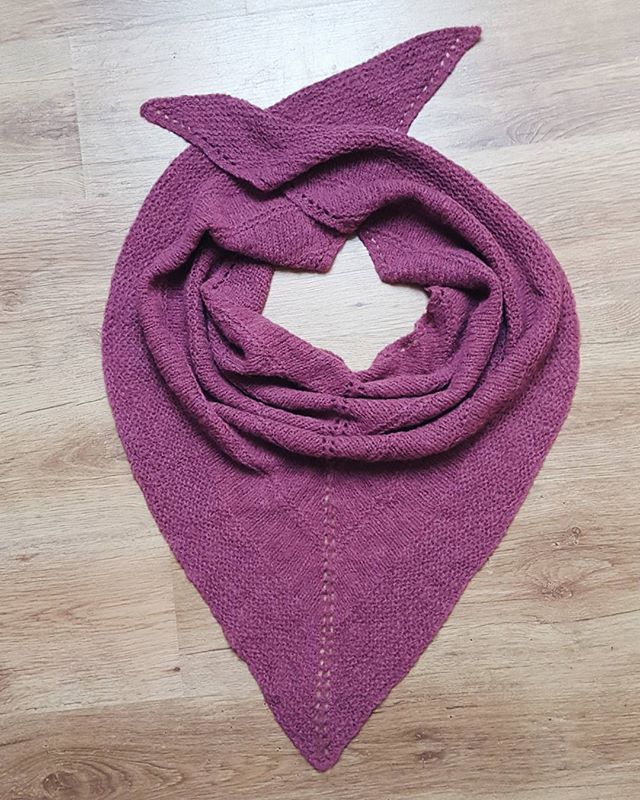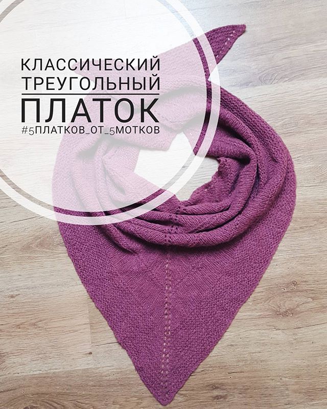 Треугольный платок — самый распространенный вид платков. Вяжется он из середины, за счет выполнения четырех прибавок (две по краям и две вокруг центральной петли) принимает форму равнобедренного треугольника.