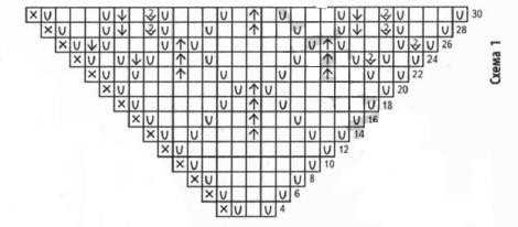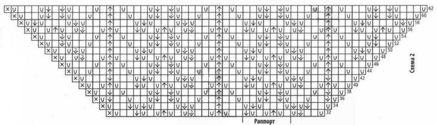С 32 ряда начните работать по схеме 2. Повторите вязание с 32 по 62 ряды два раза, или пока шаль не станет нужного размера. Закройте полотно.