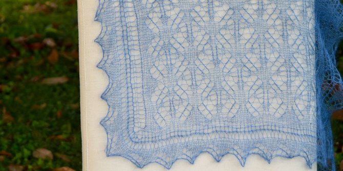 — оригинальная кайма вдоль тела платка. Данная модель платка позволяет вывязывать кайму вдоль тела. Самый простой вариант каймы — это платочная вязка, которая повторит кайму, идущую по краям платка. Более сложные — различные вариации на тему листьев, ромбов и даже кос. Описание вязания