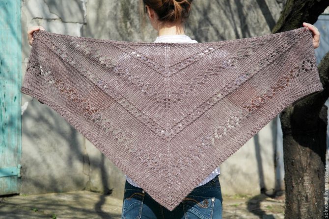 Это самый сложный в плане исполнения платок. Треугольная форма формируется за счет одновременного выполнения прибавок и убавок с двух сторон платка.