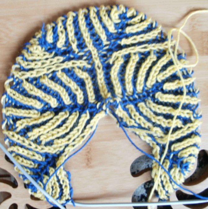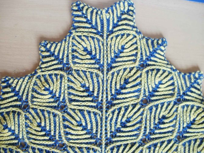 — лицевая гладь с добавлением теневых и/или ажурных узоров; — вязание полосами из однотонной и секционно окрашенной пряжи (2 ряда одной пряжи, 2 ряда цветной). Такой вариант выглядит очень эффектно, особенно если полосы выполнены из пряжи контрастных цветов. При вязании полосами шириной по 2 ряда не нужно каждый раз обрывать нить. Если менять нить в начале каждого лицевого ряда и не затягивать нити, то их смена будет практически незаметной.