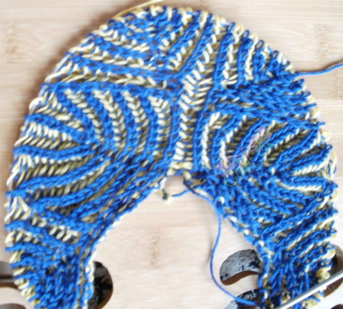 1 ряд: 2 лиц, ПН, 1 лиц, ПН, переснять маркер, 30 лиц, переснять маркеры, ЛН, 1 лиц, ЛН, 2 лиц. 2 ряд: все петли вязать лицевыми, при этом накиды провязывать скрещенными, правые — за заднюю полупетлю, левые — за переднюю. 3 ряд: 2 лиц, ПН, лиц до маркера, ПН, переснять маркер, 30 лиц, переснять маркер, ЛН, лиц до последних 2 петель, ЛН, 2 лиц. 4 ряд: все лицевые, накиды провязывать скрещенными. Повторять 3-4 ряды. Петли закрывать свободно, как лицевые.